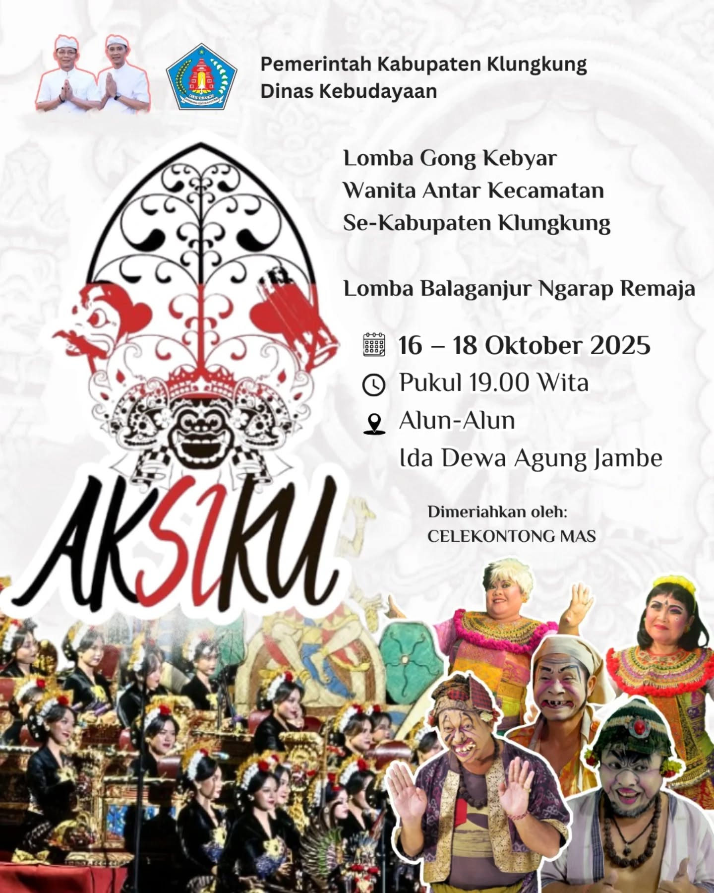 Mari saksikan dan dukung semangat pelestarian seni serta budaya Bali melalui ajang AKSIKU, wadah kreativitas dan kebanggaan masyarakat Klungkung.